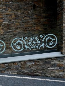 Zabudowa szklana ``wiatrołap`` z wzorem piasakowanym, nierdzewne okucia
