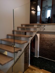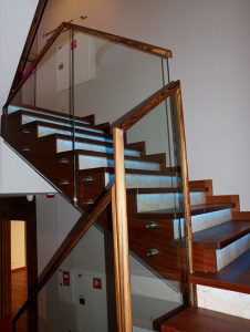 balustrada szklana mocowana punktowo elementami ze stali nierdzewnej do drewnianych schodów, samonośna