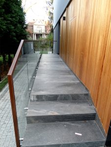 balustrada szklana mocowana punktowo elementami ze stali nierdzewnej do betonowych schodów, samonośna z poręczą drewnianą